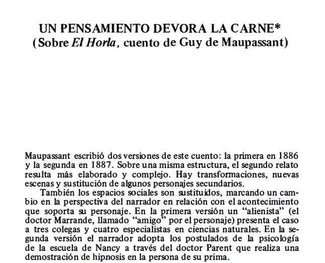 # (13 de septiembre 1979). Un pensamiento devora la carne (sobre El Horla, cuento de Guy de Maupassant). Leído en la Asociación de Psicólogos de Buenos Aires. Publicado en Serie Psicoanalítica N°4. Incluido en (1980) Psicoanálisis. Una política del síntoma (pp.197-210). Zaragoza: Editorial Alcrudo. - Click en la imagen para leer el texto completo -