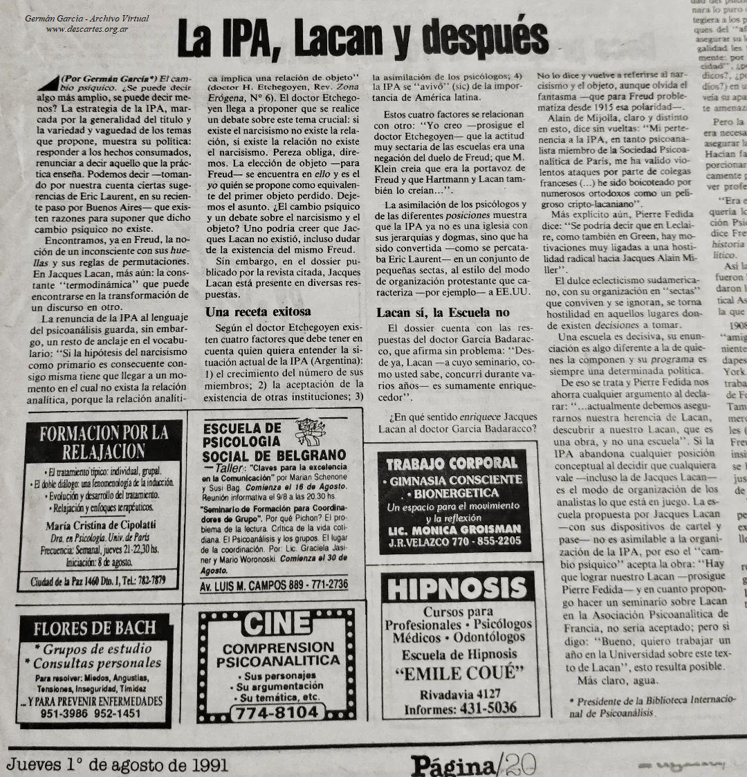 # (1 de agosto 1991). La IPA, Lacan y después. En