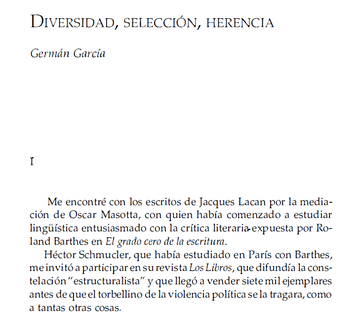 (2001). Diversidad, selección, herencia. Intervención. Coloquio “Lacan Argentino”. Publicado en (2001) Lacan Argentino (pp.57-61). Testimonios transgrupales en ocasión del centenario del nacimiento de Jacques Lacan. Buenos Aires: Ed. Paidós.